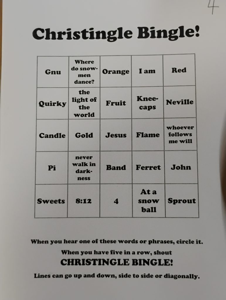 Today Revd. Carolyn told us all about the meaning of Christingle. When we heard any of the words or phrases on the sheet we circled them. When we had five circled in a row we shouted out